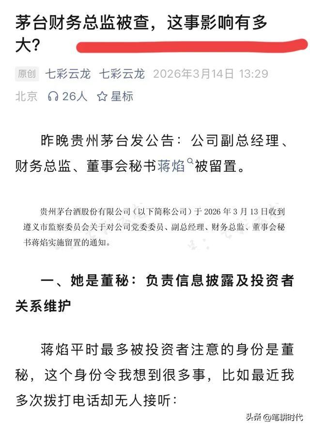 2026年3月13日,贵州茅台突曝高管被查讯息,蒋焰因涉嫌严重违法坐法,被关连部门留置。