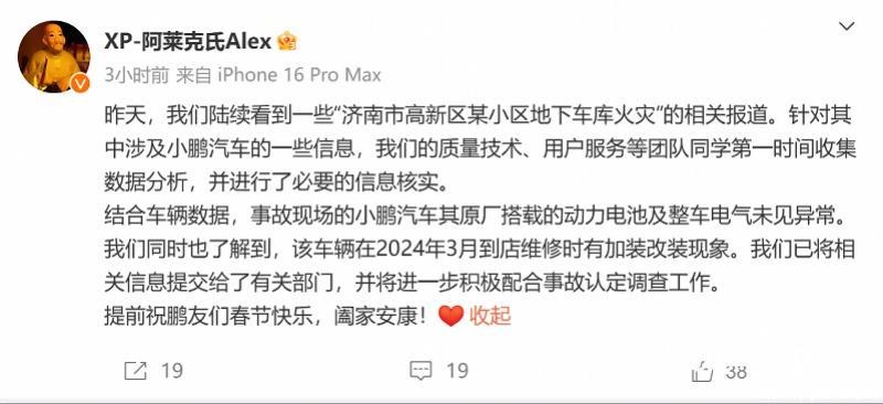 1月25日,小鹏汽车公关负责东说念主通过微博账户@XP-阿莱克氏Alex答复济南市高新区某小区地下车库失火事故,该事故此前被认定生气点为一小鹏汽车。小鹏汽车公关负责东说念主默示,衔尾车辆数据,事故现场的小鹏汽车其原厂搭载的能源电板及整车电气未见终点,同期也了解到,该车辆在2024年3月到店维修时有加装改装局势。“咱们已将联系信息提交给了联系部门,并将进一步积极配合事故认定傍观责任。”